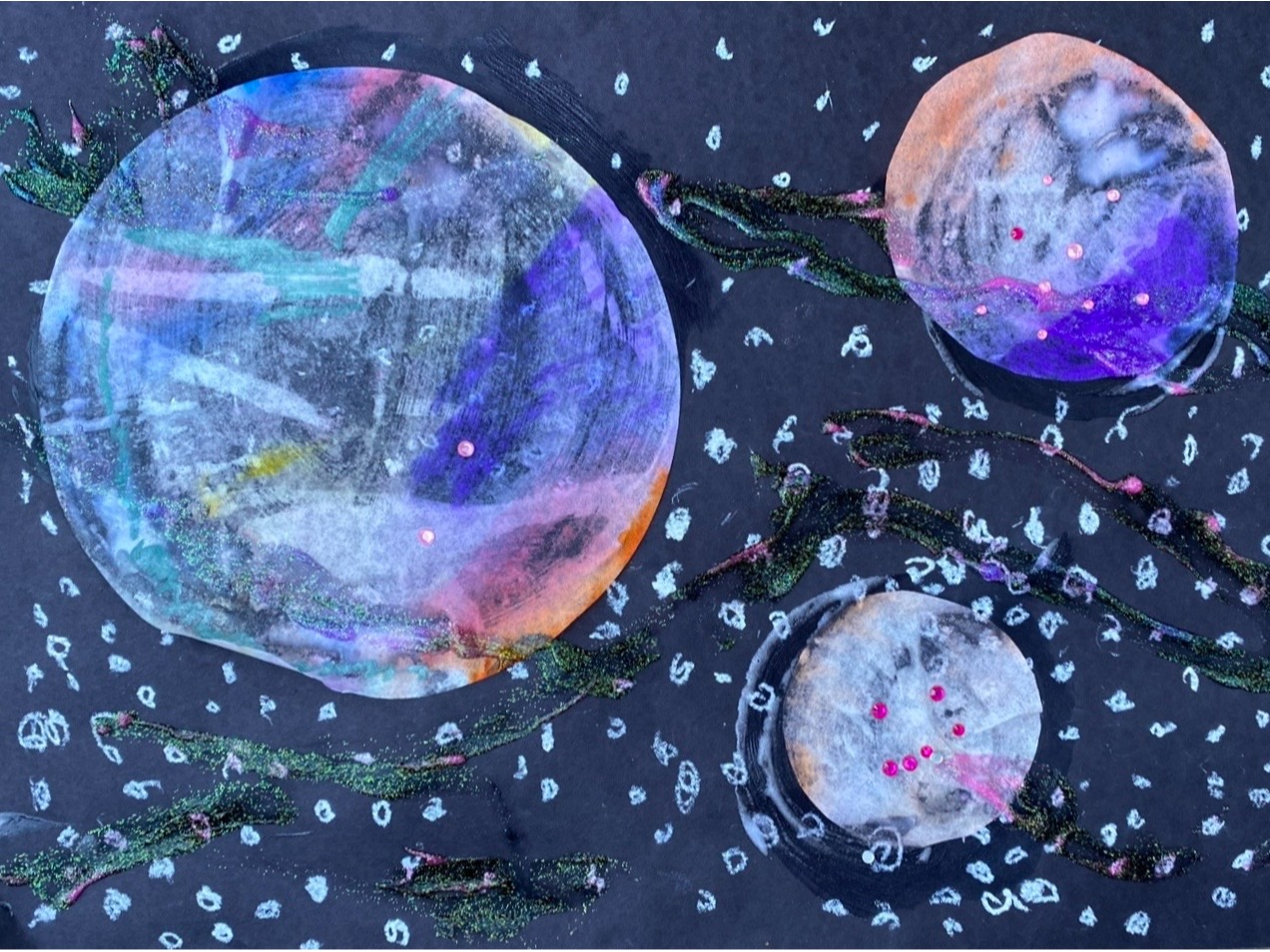 Aliens, marbleized planets and swirling galaxies...get ready for an out of this world art class! Over the course of the session students will explore all kinds of different art making processes and materials. They will paint with watercolor and salt, sculpt masks and astronaut helmets and even stick their hands in shaving cream to marbleize paper! This is sure to be a fun class for everyone filled with lots of magic and a few surprises!